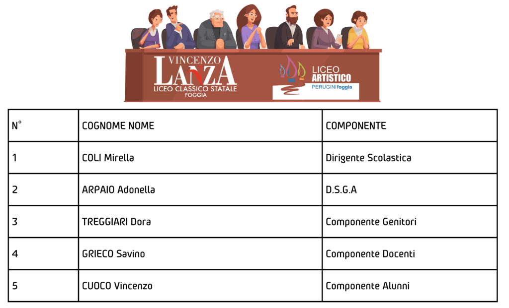 La Giunta Esecutiva è un organo composto da due membri presenti di diritto che sono la Dirigente Scolastica e la D.S.G.A. e da altri quattro membri eletti ogni tre anni (ad eccezione della componente alunni eletta annualmente) ovvero: