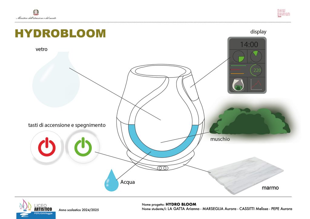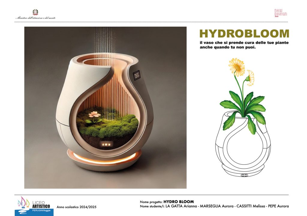 Con il progetto “HIDROBLOOM” le alunne La Gatta Arianna, Marseglia Aurora, Cassitti Melissa e Pepe Aurora, della classe 3L – indirizzo di grafica del Liceo Artistico Perugini, guidate dalle docenti Antonietta Ciavarella e Emanuela Sassano, guadagnano la partecipazione all’evento finale del concorso “New design”.