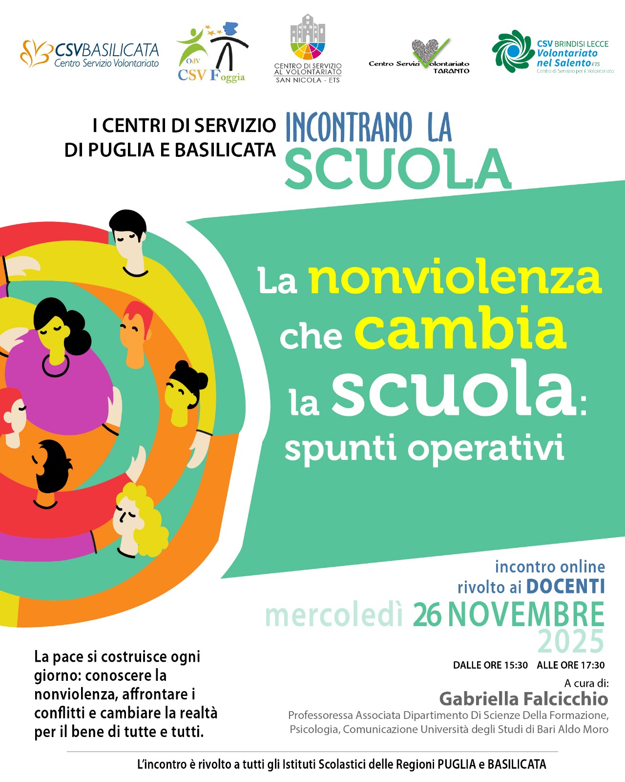 Il CSV Foggia, assieme ai CSV di Puglia e Basilicata, organizza un seminario online rivolto ai docenti di ogni ordine e grado dal titolo “La non violenza che cambia la scuola: spunti operativi”, a cura della professoressa Gabriella Falcicchio.